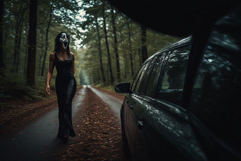 As she walked, a car appeared in the distance, headlights cutting through the trees. Inside, a man rolled down his window, slowing as he approached. Clearly, he didn’t get the memo that Halloween costumes come with boundaries. He leaned out, ready to toss out the classic “Hey, gorgeous!” line.