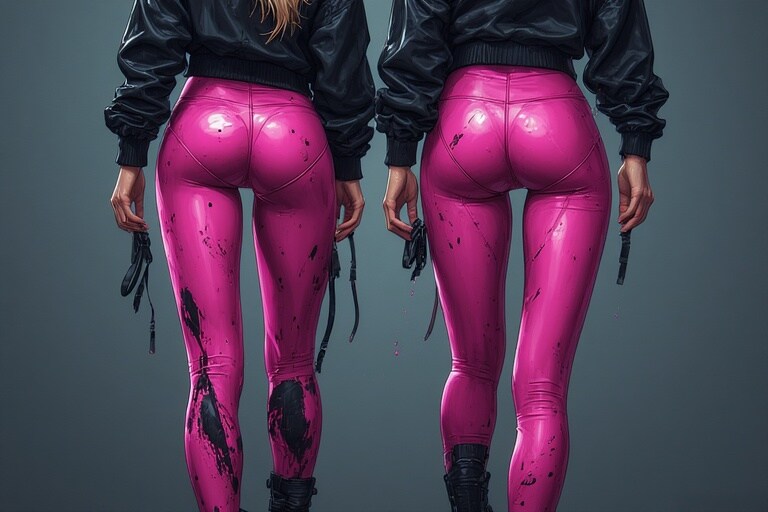Both women were rocking pink wetlook leggings that shimmered with every step, paired with sleek black wetlook long-sleeve tops. The combination was daring, futuristic, and a little bit otherworldly like they’d stepped straight out of a high-fashion music video and accidentally wandered into reality. Pedestrians paused mid-step. Some whispered. Some openly stared. Even the pigeons hesitated, trying to figure out if they had accidentally landed on a runway.