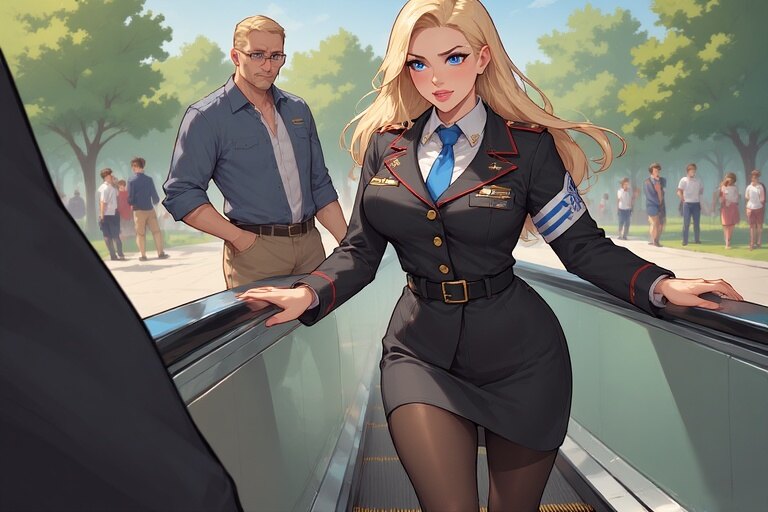 She wasn’t really doing anything at least, nothing obvious. Hands at her sides, slight tilt of the head, one foot slightly forward as if she were about to announce, “Welcome aboard.” The escalator carried her upward steadily, yet she radiated purpose, like she had somewhere extremely important to be, or perhaps she was secretly running the world.