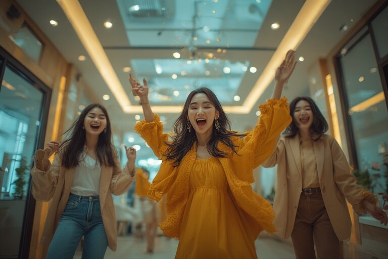 Her friends blinked. And then, without hesitation, they cheered. Laughter spilled into the lobby like confetti, clapping hands punctuating each twirl and spin. One friend leaned forward, fists pumping in excitement, shouting silent encouragement with her eyes. The other did a little hop in her spot, mimicking an enthusiastic cheerleader, delighted by the spectacle.