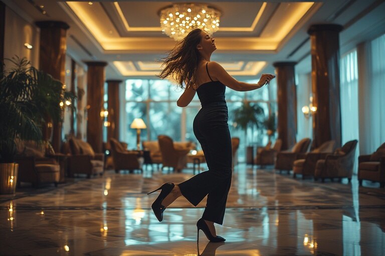 There she was: a lady in a sleek black outfit, heels clicking with each step, moving as if the entire space were her personal stage. She wasn’t just walking she was dancing. Arms swayed, hips moved, and every turn carried a sparkle of mischief. The heels didn’t slow her down; if anything, they made her movements sharper, more playful, a beat that seemed to echo through the lobby.