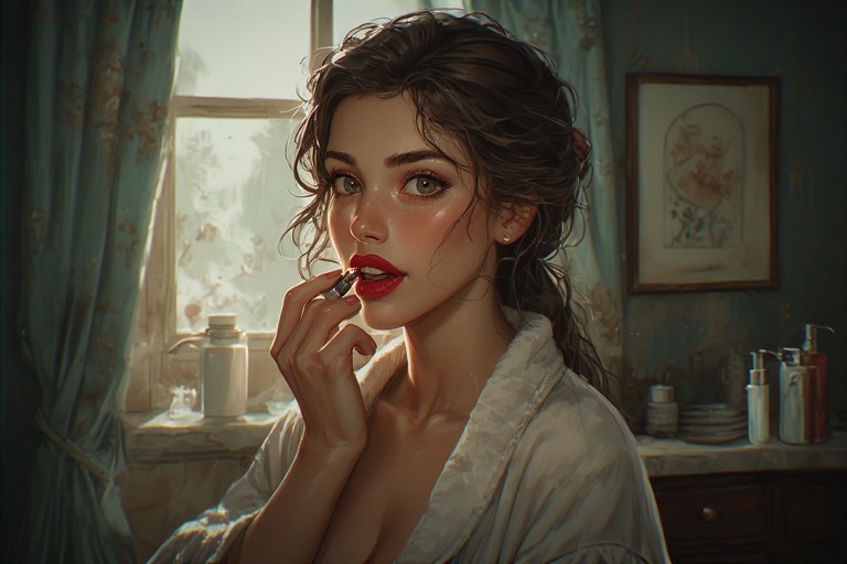 She steps closer to the mirror and adds a touch of lipstick. Instantly, her reflection changes. The towel stays, the bathrobe stays but the confidence begins to show. A little color on the lips turns a sleepy morning into a “yes, I’ve got this” moment.