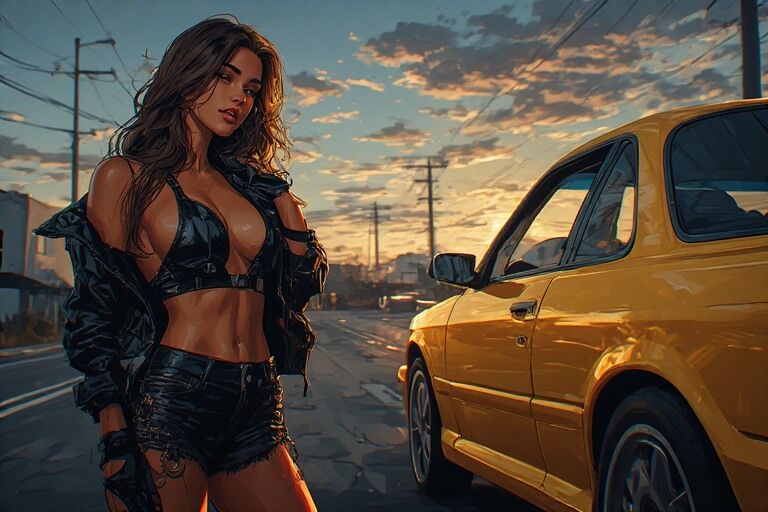 Out of nowhere, a bright yellow car slows down and stops at the curb. The window rolls down with a