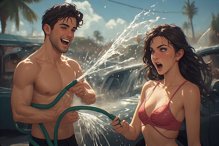 What Makes Him Suddenly Turn the Hose Toward His Girlfriend?