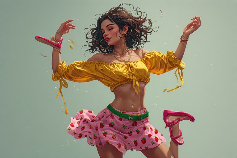 Picture this: a sunny day, music in the air, and there she is—rocking a yellow off-shoulder crop top blouse paired with a pink mini skirt covered in playful strawberry prints. A green belt cinches it all together like the final touch of a masterpiece, and her pink high-heeled sandals (with those dramatic wrap-around straps) say, “Yes, I will dance and yes, I will do it fabulously.”