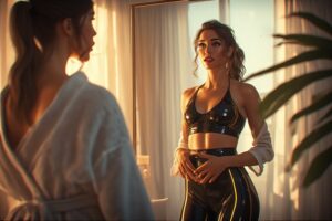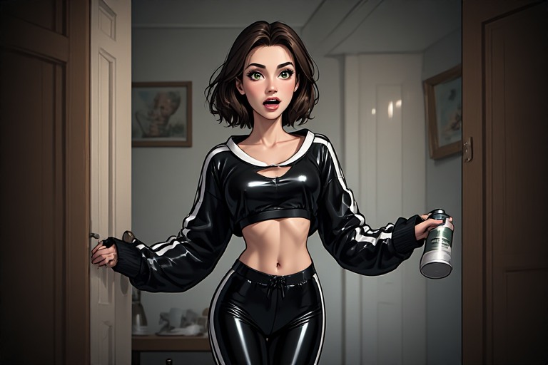 She turns toward a nearby mirror. The black shiny crop top and leggings reflect light with a bold, almost futuristic shine. The white stripe detail still faintly visible, now contrasted in a way that feels intentional and high-fashion.