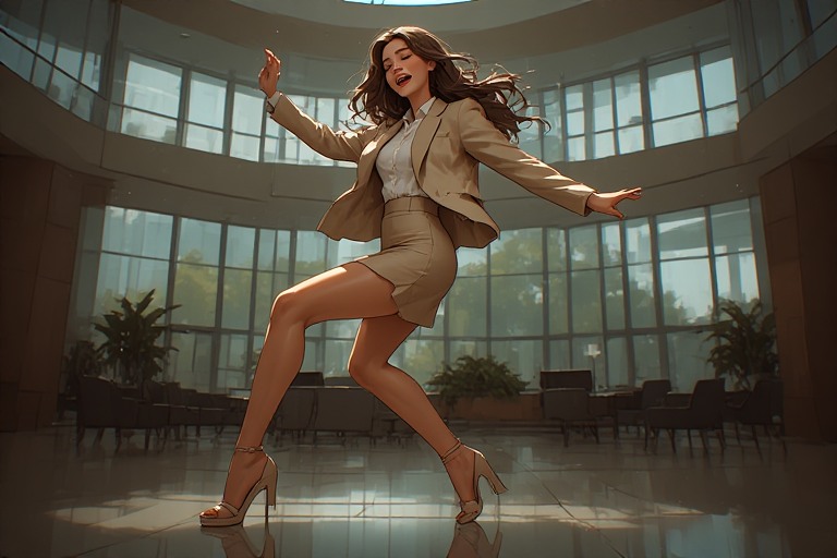 She enters the lobby in a full beige office ensemble that looks like it was carefully negotiated between “corporate professionalism” and “fashion magazine cover shoot.” A long sleeve beige blazer sits perfectly tailored over a matching beige mini skirt, while beige high-heeled sandals with ankle straps click confidently against the glossy floor.